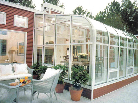 如果做平頂結構的陽光房,我們普通的材料制作陽光房肯定是要下垂的,那么遇到跨度超過5米小于10米的時候,我們可以設計人字頂來改變頂面承重的受力方向,做人字頂陽光房頂面用的不是整料,也就是說原來8mm的材料做平頂,最長的材料必須要達8mm,現在做平頂知道4m就足夠了,當然除了做人字頂,還有其他的造型頂可以選擇的買入圓弧頂,組合頂等。