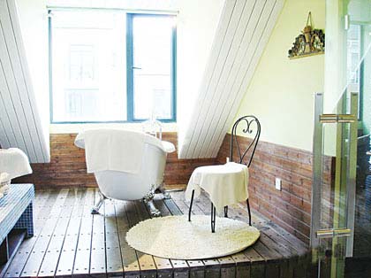 閣樓衛浴間如果直接擺放浴缸,沐浴的時候看到頭頂的斜坡會有種壓抑感。墊高后的浴缸正好正對著窗口,當主人在享受洗浴帶來的舒適感的同時,還可以順便看看外面的風景。而相比較瓷磚和馬賽克,桑拿木的腳感更溫暖、更舒適,為整個衛浴間增加了裝飾效果。