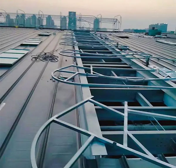 3、骨架裝配:每條天窗根據長度有不同數量的墻架。按固定米數一個單元或特殊單,通風氣樓底腳與基礎采用專用連接件,固定前先將相鄰的兩個墻架或底座固定在指定位置上,然后測量相鄰兩架和底座的直線距離誤差和對角誤差,直線距離誤差和對角誤差不得超過3mm。誤差在允許范圍內時將通風器墻架與基礎固定牢固,依次安裝到最后一個墻架。